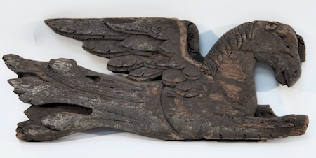 (‘Hippocamp’, a wooden carving in the form of a winged horse, originally part of the panelling inside Stafford Castle: Staffordshire County Museum Service)
